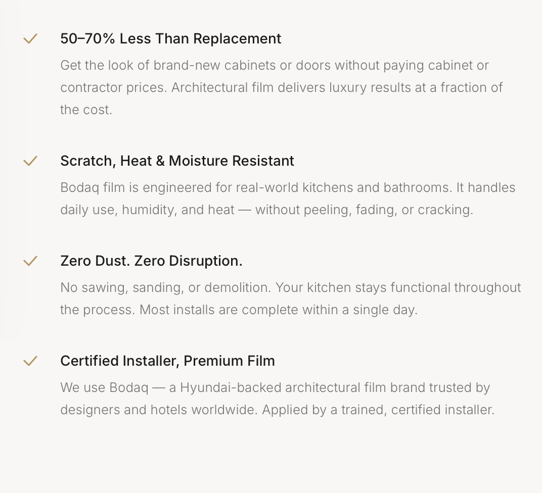Architectural film for cabinets, vanities, built-ins, doors, and commercial surfaces. Get a refined new look in as little as 1-3 days*, without tear-out, dust, or major disruption.