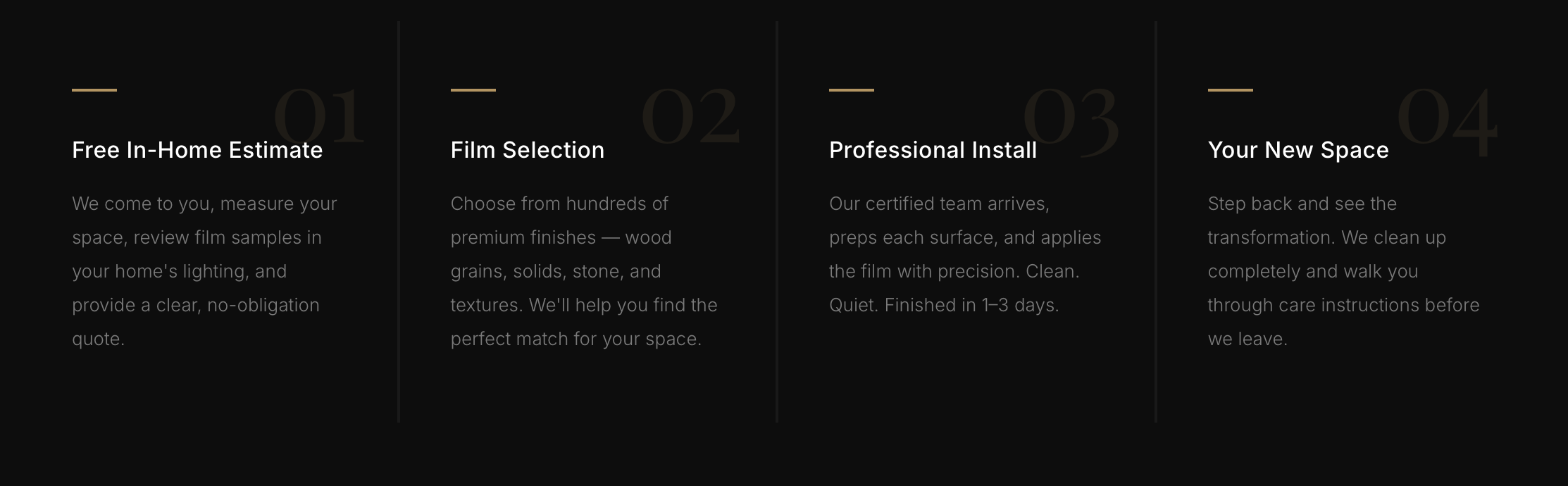 Explore wood grains, matte finishes, solid colors, and stone-inspired looks from leading architectural film brands. We help guide finish selection based on the style of your space, the surface type, and the overall result you want to achieve.